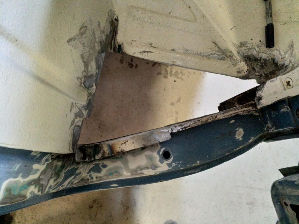 Selv om bussen egentlig ikke så rusten ud, så gemte der sig alligevel en del. Jeg startede med at skære rust fra i de mest komplekse områder. Det er fx ved B stolpen, hvor både nederste del af B stolpen, mellemvæggen, forskærme og inderskærm mødes. Og jeg fandt rust…mere rust og lidt mere rust 🙂 Så jeg valgte at sende bussen til en dygtig pladesmed og får lavet de store dele. Så kunne jeg selv fortsætte, når bussen kom hjem igen.